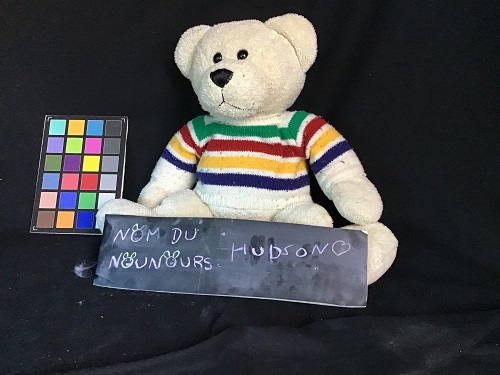 - C'est un ours polaire avec un tee-shirt rayé. Il vient de Vancouver Virgae-arum veut dire rayures en latin.