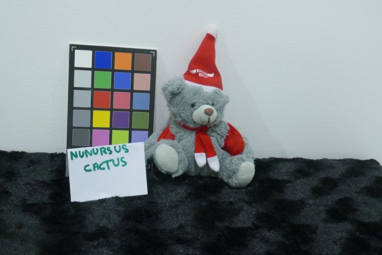 - L'ours porte une écharpe, un bonnet de Noël rouge et un manteau rouge