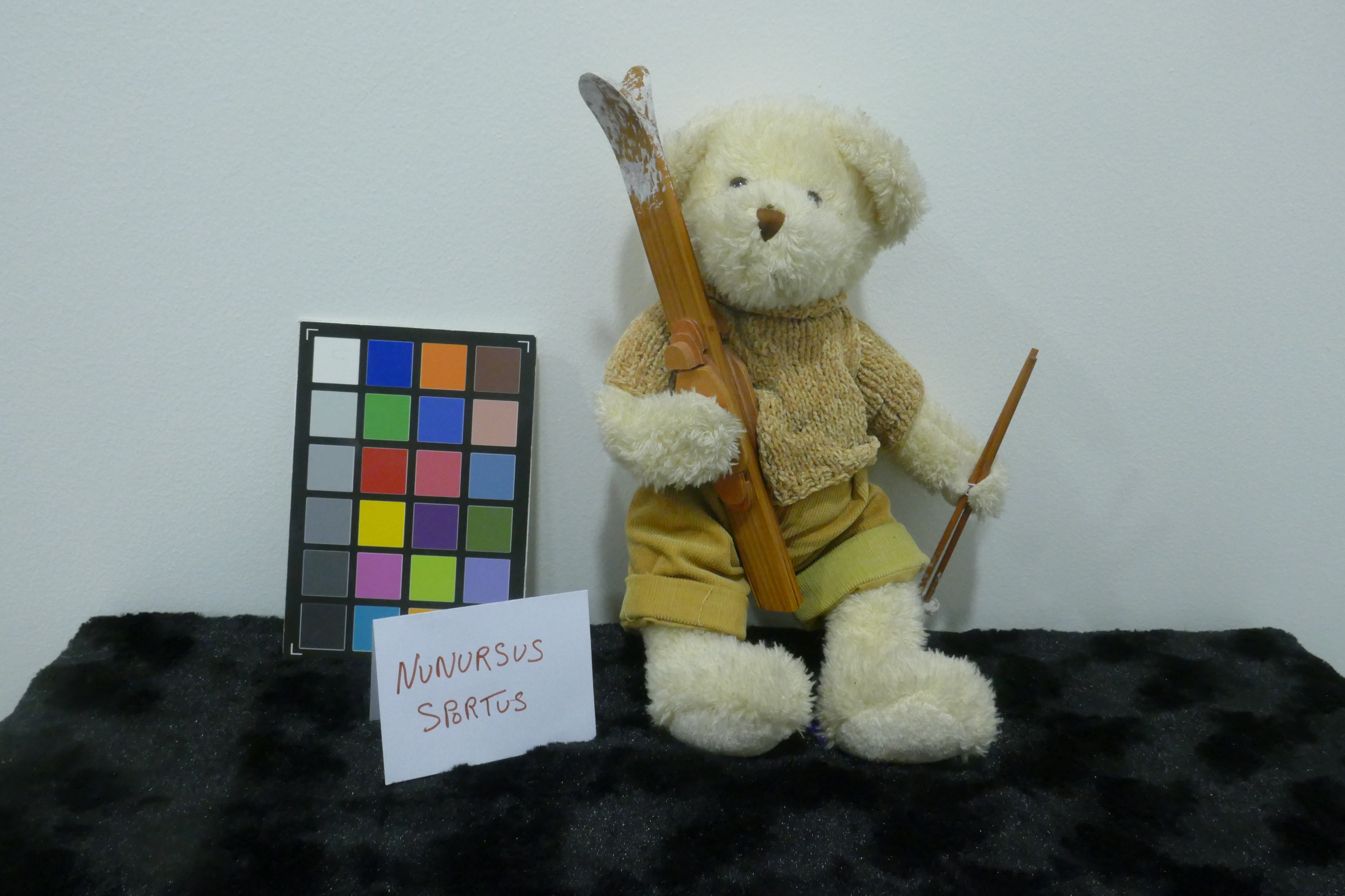 - Porte un pull, un pantacourt, des bâtons de ski dans la patte gauche avant et des skis dans la patte droite avant. Au touché on peut sentir des pièces de bois de renforcement au niveau des différents membres et du cou.