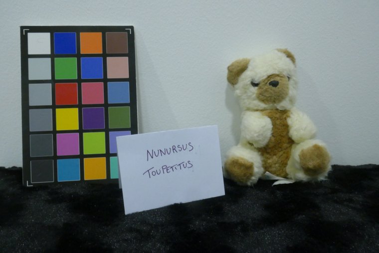 - Ours bicolore intérieur des oreilles de couleur marron ainsi que le museau, le dessous des pattes arrières et le ventre