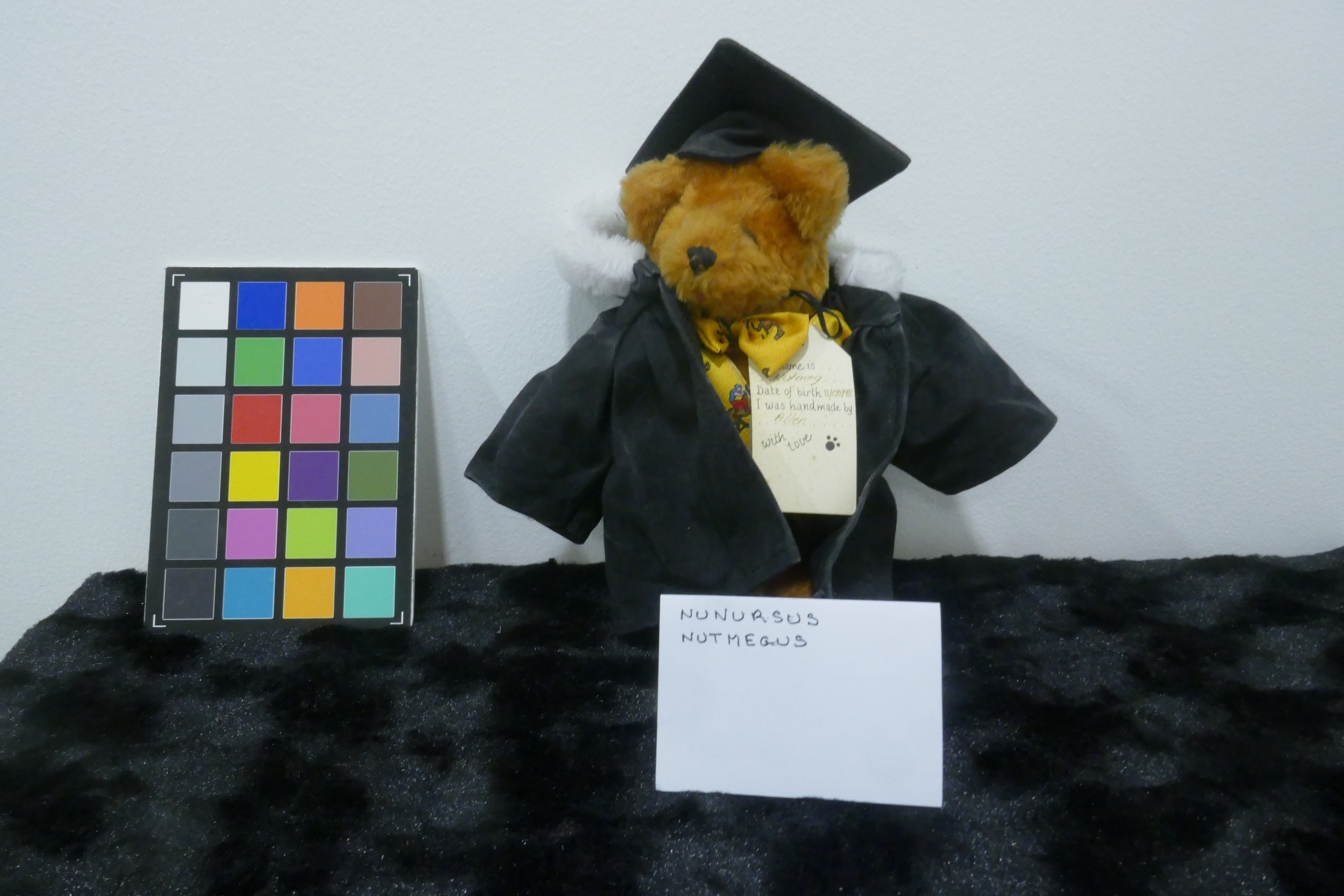 Porte un costume d'universitaire diplômé anglais. Etiquette avec nom, date de fabrication et nom de la couturière