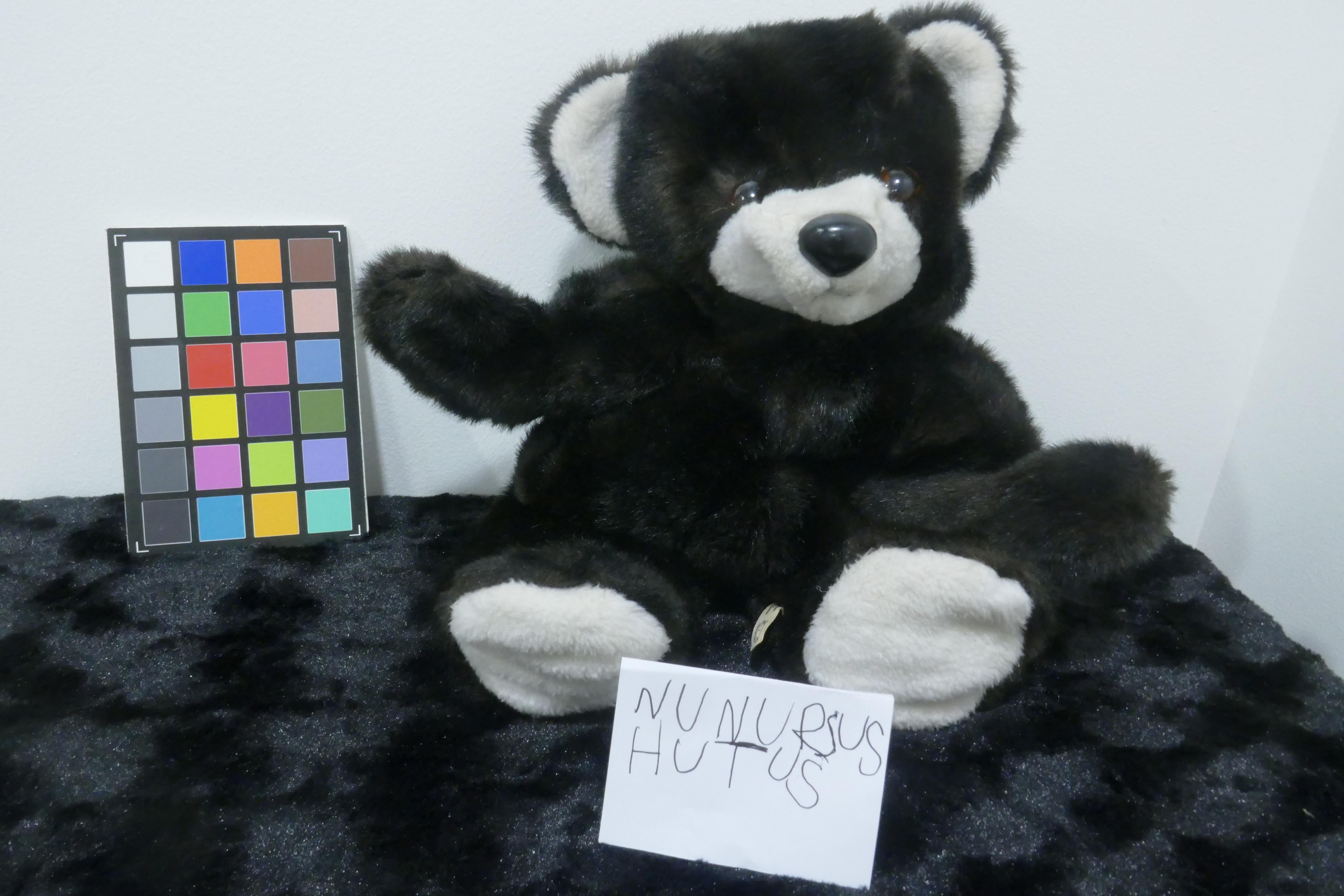 Porte une petite étiquette avec deux écureuils dos à dos dessus. C'était le nounours de ma maman quand elle était petite.