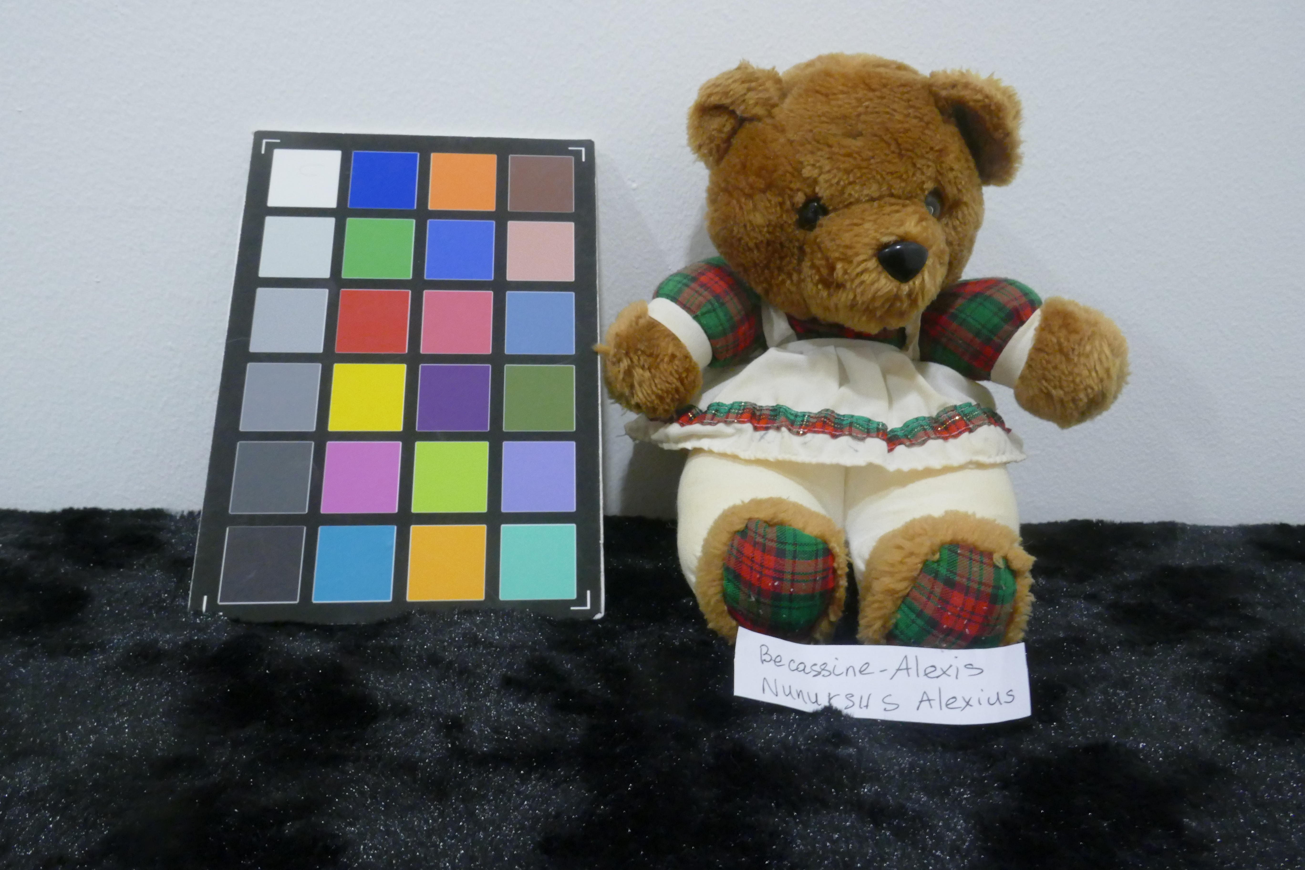 - Habillée d'un tablier et d'une chemise à carreaux et pantalon blanc. Le dessous des pieds est recouvert d'un tissu comme la chemise.