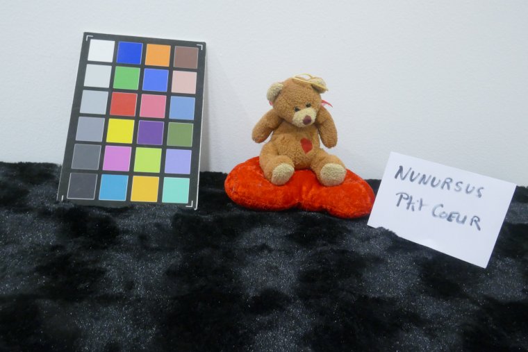 - Est assis sur un coussin en forme de coeur rouge. Porte un foulard noeud rouge, et un coeur rouge sur le bidon. Possède une attache sur le dessus du crâne.