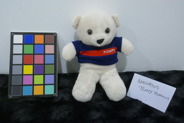 - Porte un haut de couleur bleue avec une bande rouge sur laquelle est inscrit le mot "Pompy"