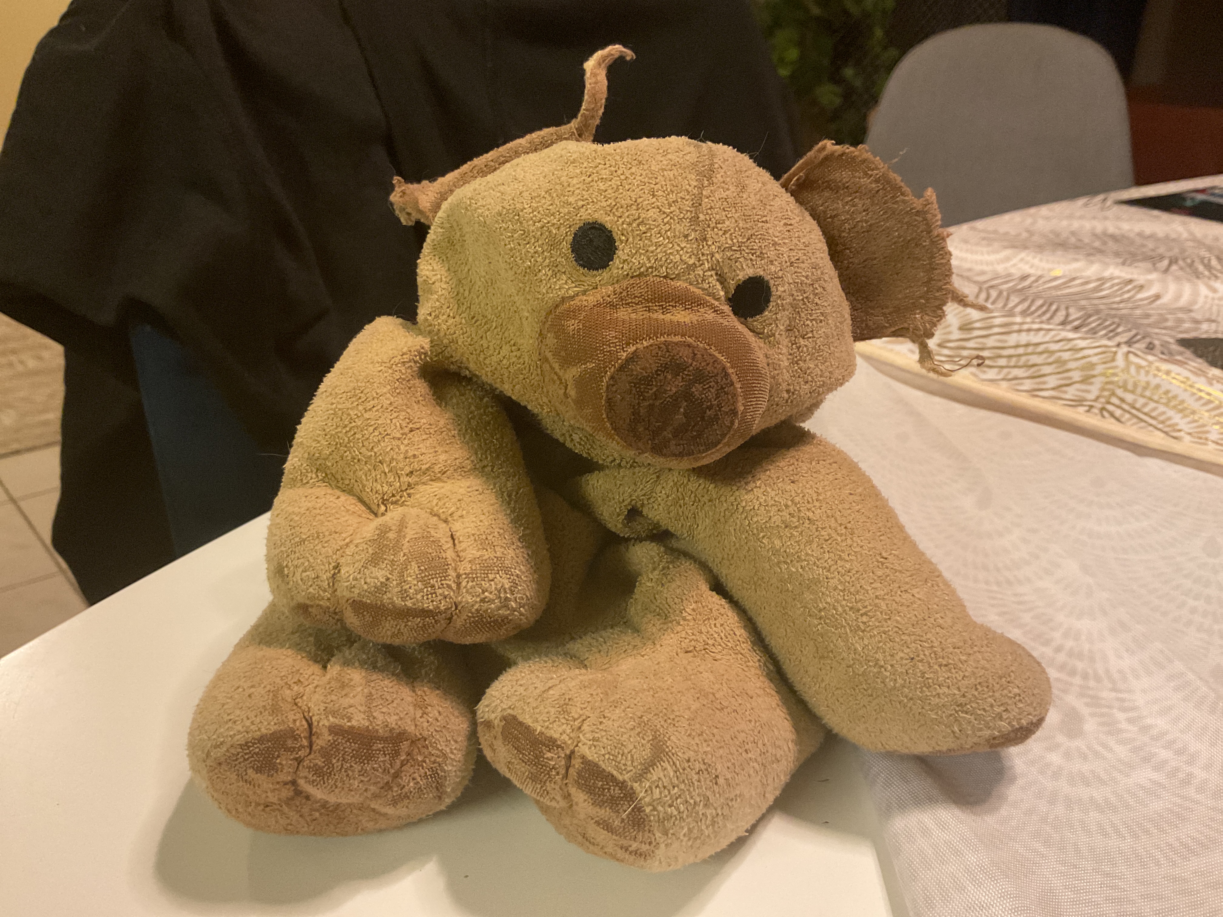 Petit yeux noir interrogateurs, sourire réservé aux bisous dans le cou . Oreilles usées par de petits doigts tricotants et tortillants, peau des oreilles et du museau râpée par contact de filets de bave échappés d’un pouce.