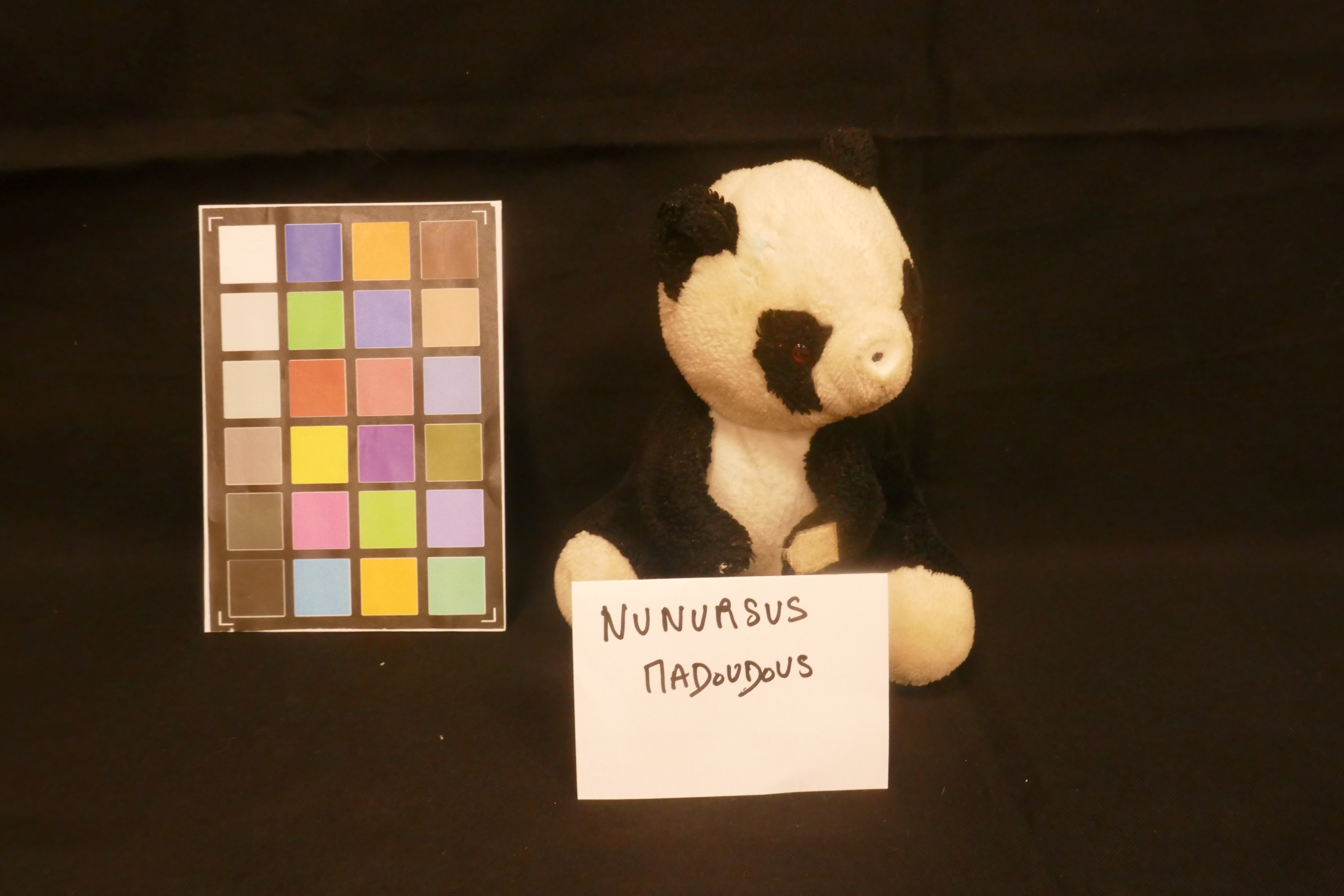 - Petite tâche bleue sur l'oreille droite, point rouge sur le crâne, museau abîmé (il lui manque un petit bout)