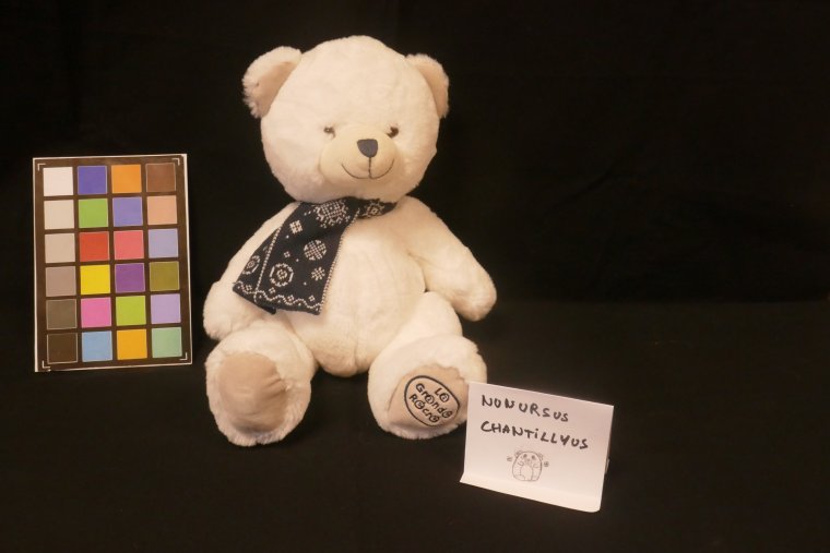 - Il a une écharpe bleue avec des flocons blancs nouée autour de son cou, une inscription sur le dessous d'une patte arrière et une étiquette sur le derrière.