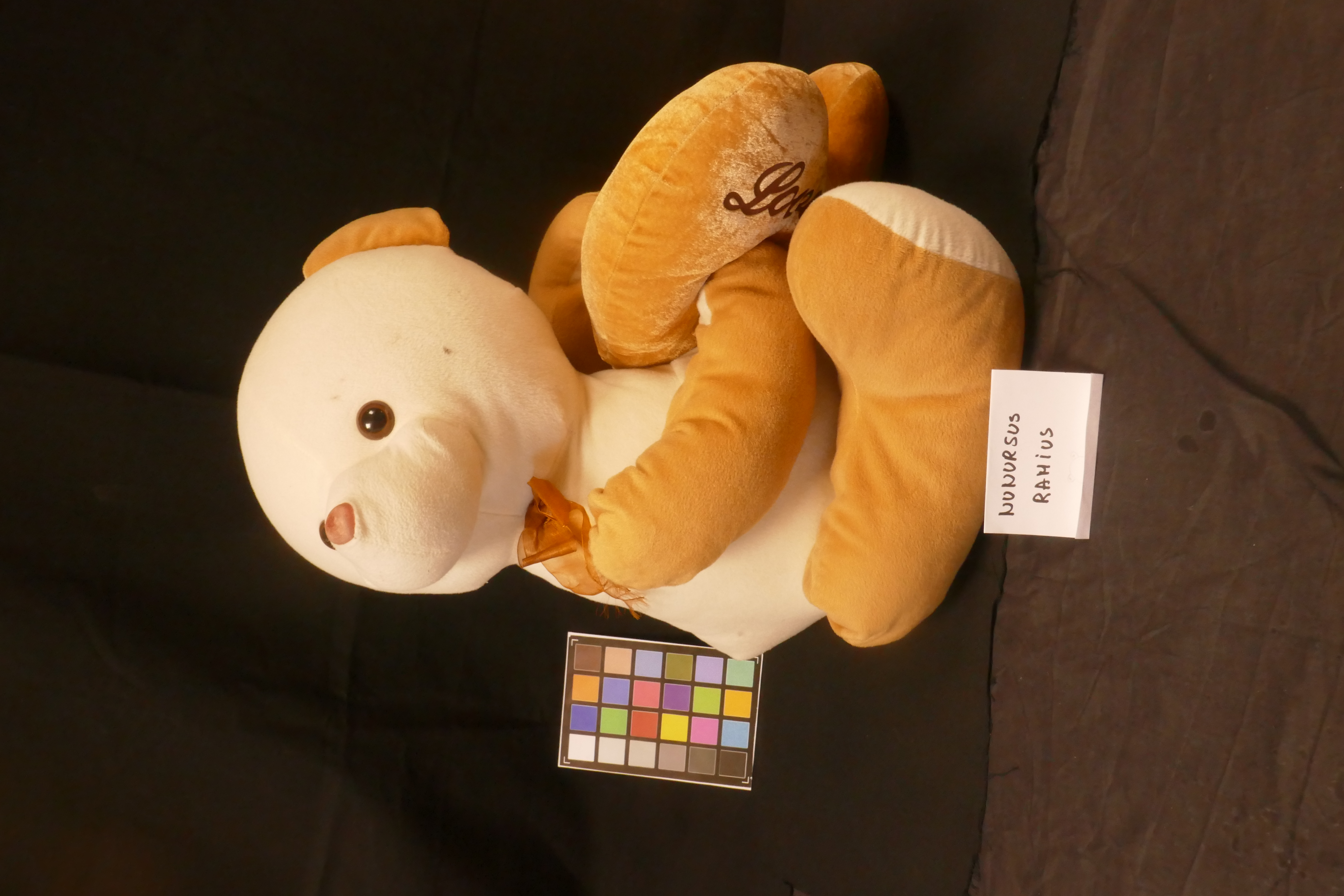 - Il porte un gros coeur dans ses pattes de devant, un noeud papillon autour du cou et une étiquette sur le derrière