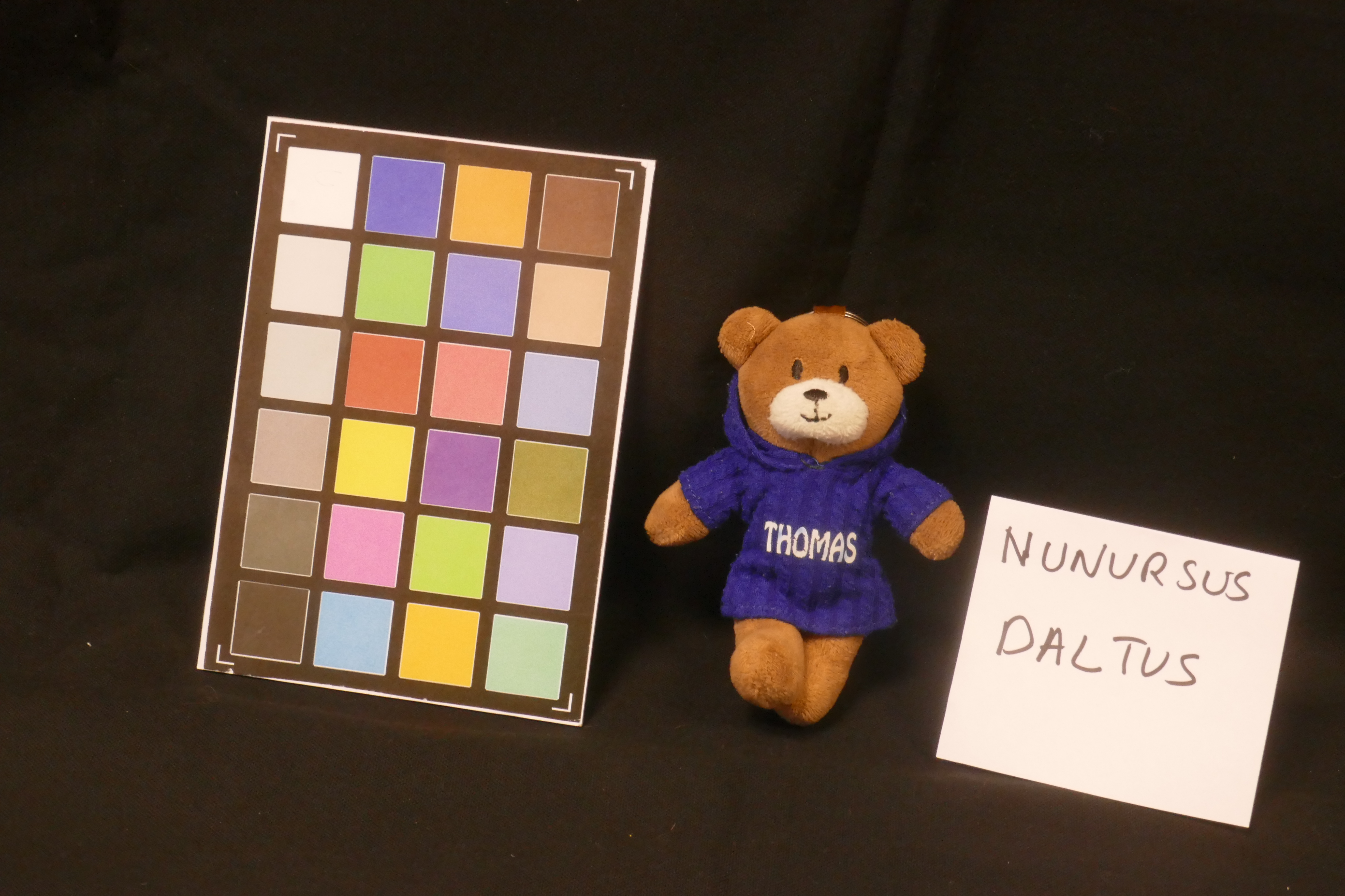 - C'est un nounours porte-clé, il porte un grand pull bleu foncé avec écrit dessus Thomas, son museau est blanc.