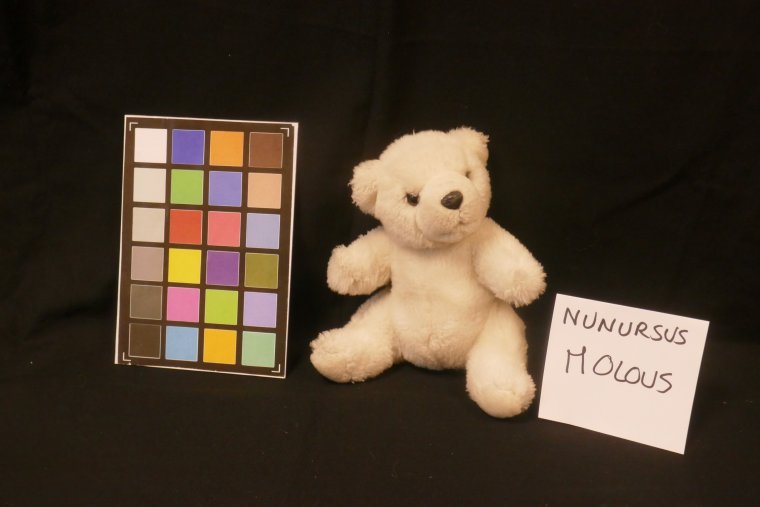 - Tête légèrement tournée vers la gauche, porte une étiquette dans le dos